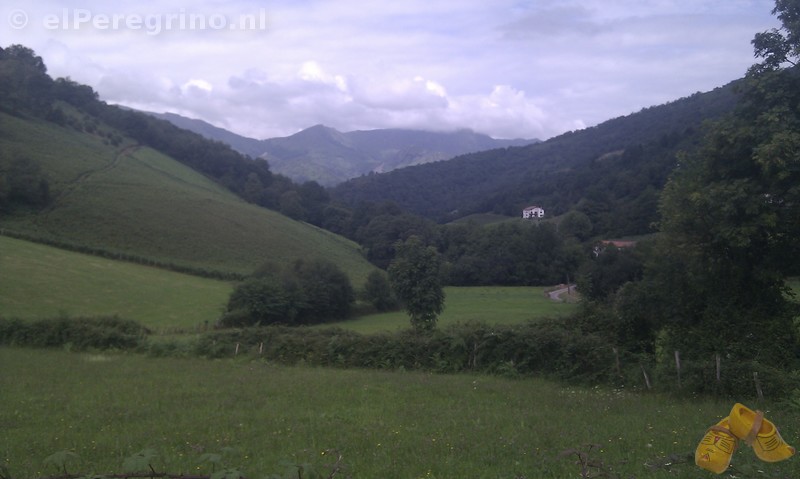 In het gebied waar ik vandaag doorheen moest zijn geen dorpen of steden; hier en daar staat een huis of een groepje huizen, of een hotel, en dat is het. Echt een streek voor wildkamperen is het ook niet, daarvoor zijn de hellingen te steil. Ik richtte me daarom op Espelette; het zag er niet echt groot uit, maar wel groot genoeg voor een mairie, en het was ver genoeg. Dat het ver genoeg was, daar moest ik aan het einde van de dag een beetje op terug komen: met al dat klimmen en dalen was het meer dan ver genoeg.